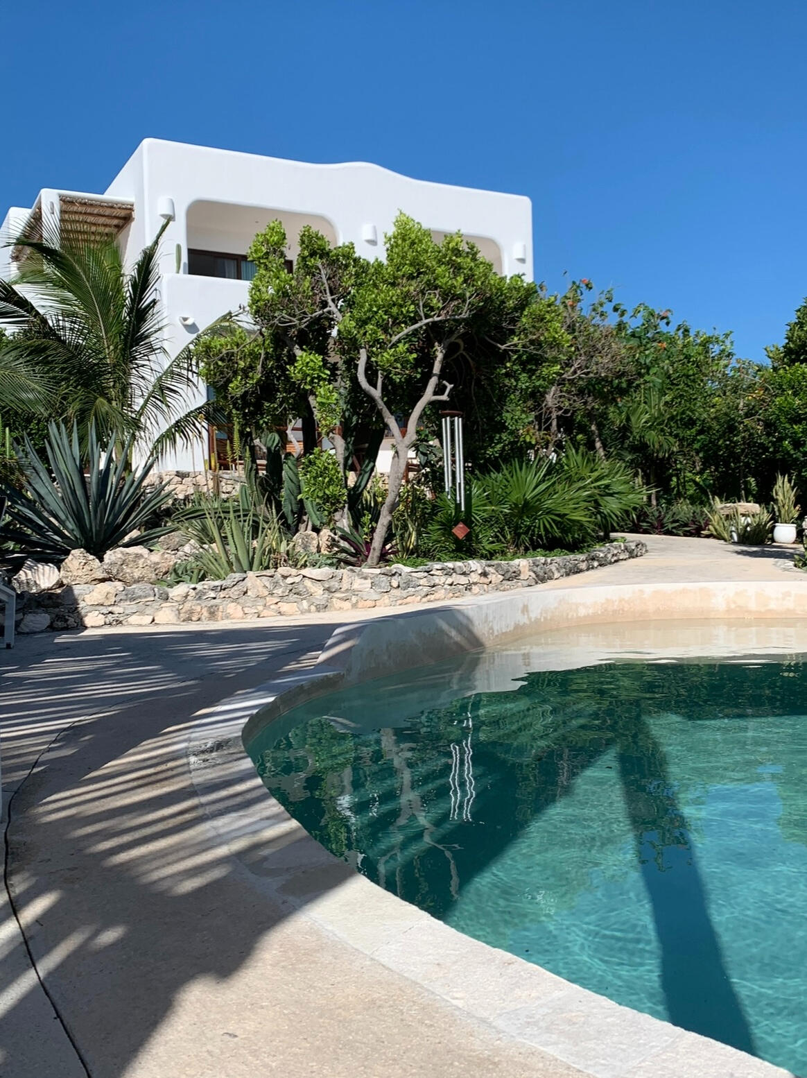 At the heart of Casa Saasil lies a serene saltwater pool, perfectly balancing luxury and simplicity. Gently heated saltwater pool for comfort,it's ideal for an early morning swim or a quiet evening under the stars. Surrounded by stone pathways, palms, and shaded lounging areras, the pool becomes the natural gathering place, a peaceful oasis that reflects the island's calm rhythm and effortless beauty.